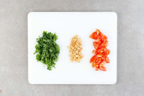 Den Koriander samt Stängeln grob schneiden. Die Erdnüsse grob zerkleinern. Die Tomaten grob würfeln.