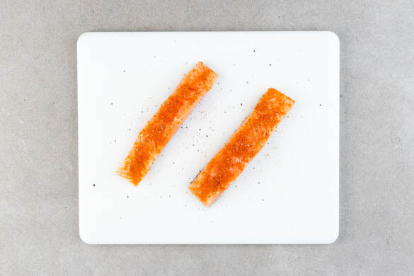 Den Fisch mit kaltem Wasser abspülen, trocken tupfen und evtl. vorhandene Gräten und Schuppen entfernen. Den Fisch von beiden Seiten mit der Gewürzmischung sowie Salz und Pfeffer würzen.