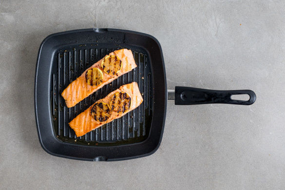 Den Lachs mit kaltem Wasser abspülen und evtl. vorhandene Gräten und Schuppen entfernen. Von beiden Seiten mit insgesamt 2EL Olivenöl sowie je 1 Prise Salz und Pfeffer einreiben. Auf der Hautseite in eine bei mittlerer Hitze erwärmte Grillpfanne oder normale Pfanne geben, mit den Zitronenscheiben belegen und 3–4Min. anbraten. Mit den Zitronenscheiben wenden und weitere 3–4Min. braten.