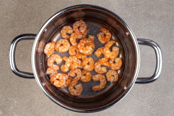 Die Garnelen in einem Sieb mit kaltem Wasser abspülen, in das kochende Wasser geben und ca. 2Min. köcheln, bis sie rosa und gar sind. Die gekochten Garnelen in das Sieb abgießen, nochmals mit kaltem Wasser abspülen, trocken tupfen und unter die übrige Dillsauce mengen.