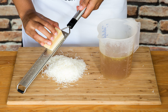Den Käse fein hacken. Das Brühgewürz in 750ml heißem Wasser auflösen.