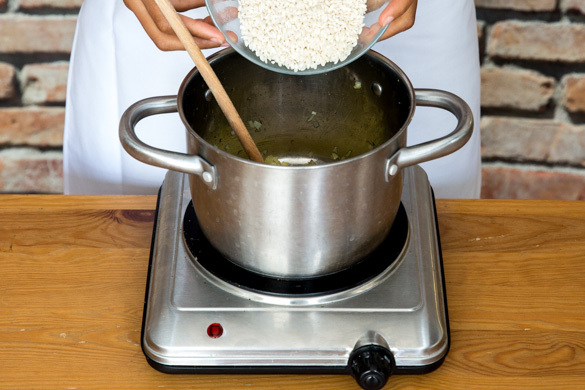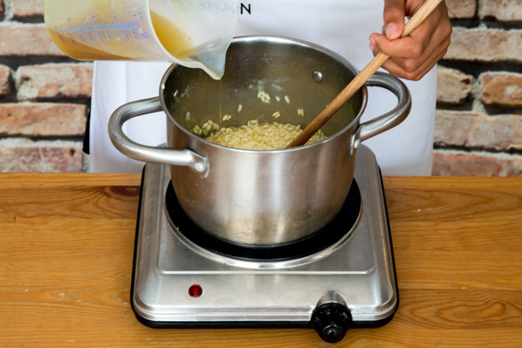 Die Zwiebeln in einem mittelgroßen Topf mit 1EL Olivenöl bei niedriger bis mittlerer Hitze 2–3Min. glasig anbraten, dann den Reis hinzufügen und ca. 1Min. anrösten.