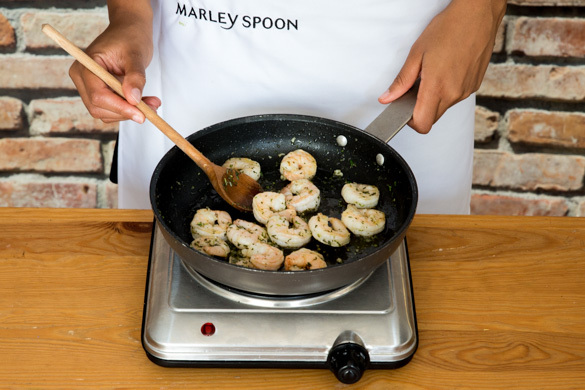 Zum Ende der Kochzeit des Risottos die Garnelen mit dem Knoblauch und dem gehackten Rosmarin in einer mittelgroßen Pfanne mit 1EL Olivenöl 2–3Min. bei starker Hitze scharf anbraten und nach Belieben mit Salz und Pfeffer würzen. Tipp: Die Garnelen nicht zu lange garen, damit sie nicht trocken werden.