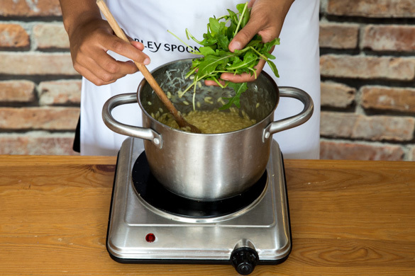 Die Hitze reduzieren und nach und nach etwas Brühe unter Rühren zum Reis hinzufügen und köcheln lassen, bis der Reis die Brühe aufgesogen hat. Diesen Vorgang 18–20Min. lang wiederholen, bis die Brühe aufgebraucht und der Reis gar ist. Zum Schluss den Käse unter das Risotto mischen.