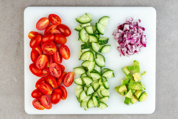 Die Tomaten halbieren. Die Gurke längs vierteln und in grobe Stücke schneiden. Die Zwiebel schälen, halbieren und fein würfeln. Die Avocado halbieren und den Kern entfernen. Das Fruchtfleisch wie die Gurke in grobe Stücke schneiden.