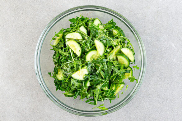 Die Gurken und den Rucola mit je 1EL Olivenöl und Essig vermengen und den Salat mit Zucker, Salz und Pfeffer abschmecken.