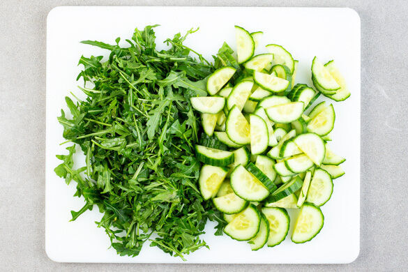 Inzwischen die Gurke längs halbieren und in dünne Scheiben schneiden. Den Rucola grob schneiden.