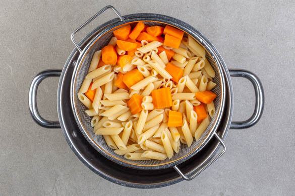 Die Pasta in das kochende Wasser geben und ca. 4Min. kochen. Die Karotten ggf. schälen und in ca. 2cm große Würfel schneiden, zur Pasta in das kochende Wasser geben und beides in weiteren 3–5Min. bissfest kochen. In ein Sieb abgießen und abtropfen lassen.