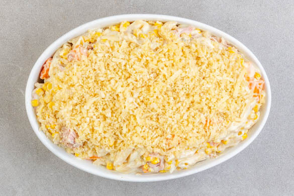 Die Pasta in eine große Auflaufform geben, die Panko-Käse-Mischung aus Schritt 1 gleichmäßig über die Pasta streuen und den Auflauf im Ofen in 25–30Min. backen, bis er blubbert und die Panko-Käse-Mischung goldbraun ist.