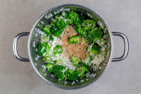 Den Reis in einem Sieb kalt abspülen, bis das Wasser klar bleibt. Sobald das Wasser kocht, den Reis, den Brokkolistrunk und die Brokkoliröschen hineingeben und abgedeckt bei niedrigster Hitze 10–12Min. kochen, bis das Wasser aufgesogen ist und der Reis und der Brokkoli gar sind. Noch ca. 5Min. ohne Hitzezufuhr ziehen lassen.