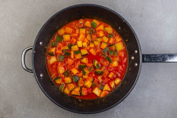 Die Zucchini und die Zwiebeln in einer großen, ofenfesten Pfanne mit 4EL Olivenöl bei mittlerer Hitze 3–4Min. anbraten, bis alles weich ist. Dann den restlichen Knoblauch, 1TL Oregano, die passierten Tomaten, 150ml Wasser und je ½TL Salz und Pfeffer hinzugeben, zum Kochen bringen und ca. 5Min. abgedeckt kochen lassen.