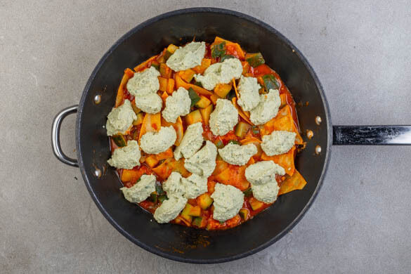 Die Pfanne vom Herd nehmen, die Sauce probieren und ggf. mit mehr Salz und Pfeffer nachwürzen. Die Lasagnestücke unterrühren, dann den Ricotta mit einem Löffel in die Pfanne geben und in die Sauce einbetten.