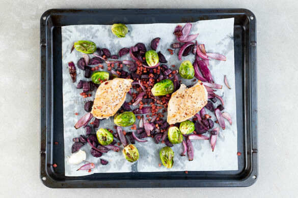 Das Fleisch trocken tupfen und jeweils in 2 flache Schnitzel halbieren. Mit Salz und Pfeffer würzen, dann mit dem Speck in der Pfanne bei mittlerer bis starker Hitze auf jeder Seite 1–2Min. anbraten. Die Schnitzel und den Speck auf das Ofengemüse legen und mit dem Gemüse fertig garen. Die Pfanne nicht auswischen.