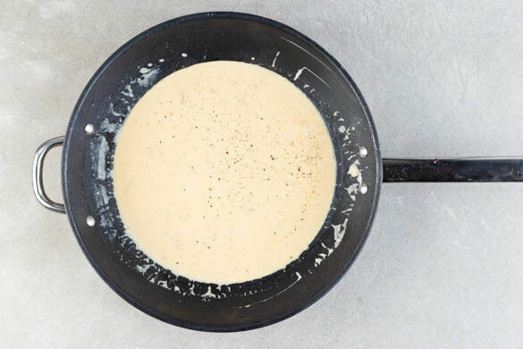 Die Crème fraîche und 100–150ml Wasser unterrühren und die Sauce noch 3–4Min. einköcheln lassen, dann vom Herd nehmen. Die Knoblauchzehe aus dem Ofen nehmen, vorsichtig mit einem Messer platt drücken, von der Schale befreien und in die Sauce rühren. Mit Salz und Pfeffer abschmecken.