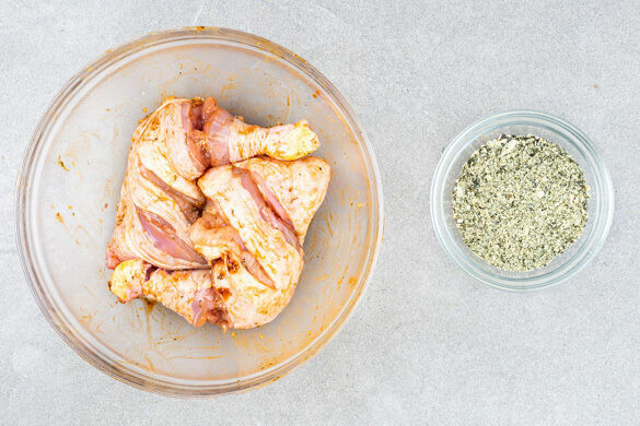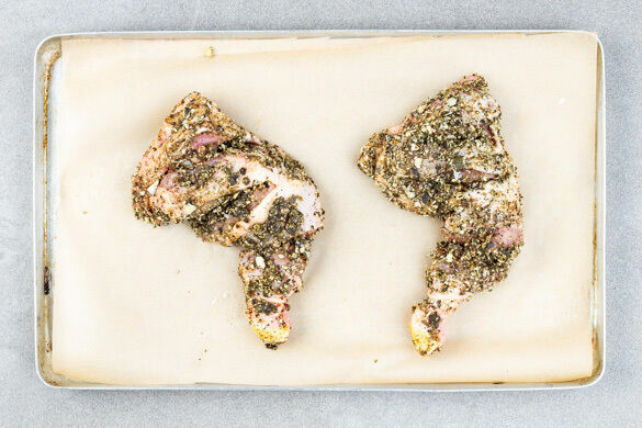 Die Hähnchenschenkel auf ein mit Backpapier ausgelegtes Backblech geben und ca. 15Min. auf der untersten Schiene im Ofen backen.