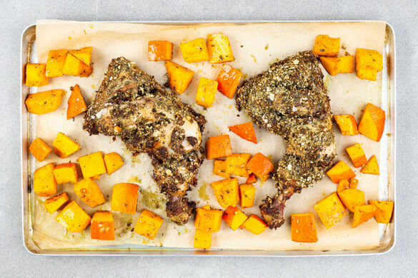 Währenddessen den Kürbis halbieren, entkernen und in mundgerechte Stücke schneiden. Dann mit 1TL Olivenöl, der restlichen Gewürzmischung sowie je 1 Prise Salz und Pfeffer würzen. Nach 15Min. um die Hähnchenschenkel verteilen und 15–20Min. mitbacken, bis das Fleisch durch und der Kürbis weich ist.