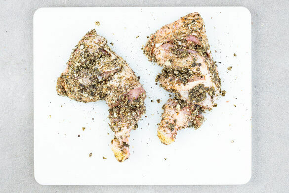 Die gehackten Kürbiskerne auf einem Teller verteilen und die Hähnchenschenkel von beiden Seiten in den Kürbiskernen wenden.