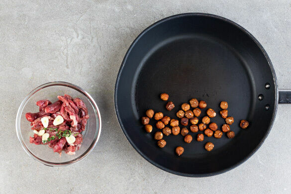 Das Fleisch trocken tupfen und gut mit Salz und Pfeffer würzen. 1EL Olivenöl mit der 1/2 des Knoblauchs und dem Thymianzweig verrühren, dann das Fleisch untermengen. Die Haselnüsse in einer großen Pfanne ohne Zugabe von Fett bei mittlerer Hitze 2–3Min. anrösten. Zum Abkühlen aus der Pfanne nehmen.