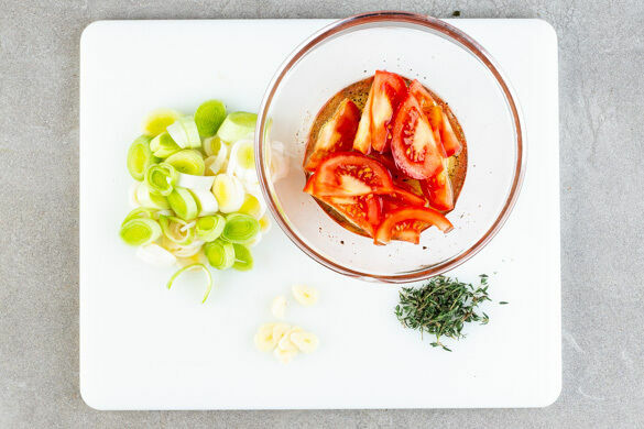 Den Lauch in ca. 0,5cm breite Ringe schneiden. Den Knoblauch schälen und in feine Scheibchen schneiden. Die Tomaten in dünne Spalten schneiden. 1EL Olivenöl, 1–2TL Essig und je 1 Prise Zucker, Salz und Pfeffer verrühren und mit den Tomaten vermengen. 1 Thymianzweig beiseitelegen, die restlichen Thymianblätter von den Stängeln streifen.