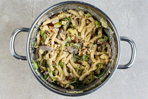 Drei Haselnüsse für ... nein, mit dreien geben wir uns nicht zufrieden, denn die gerösteten Haselnüsse sind der besondere herbstliche Kick bei unserer heutigen Pastakreation. Herzhaftes Rindfleisch badet in einer cremigen Käsesauce, für Farbe und noch mehr Aroma sorgen Lauch und frischer Thymian. Dazu passt vorzüglich der fruchtige Tomatensalat. Fast wie im Märchen!