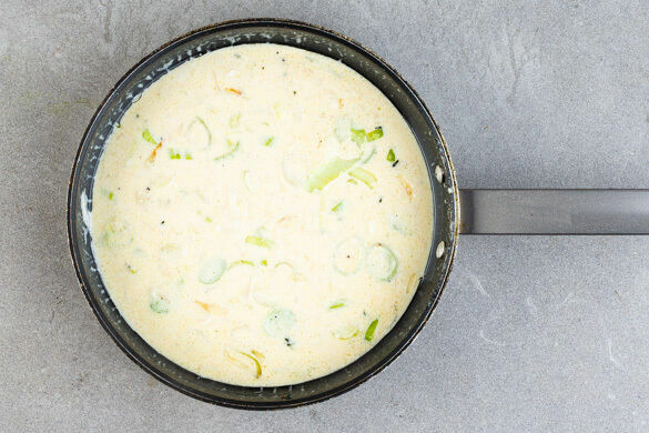 1EL Essig und 1–2EL Pastawasser in die Pfanne geben, die 1/2 des Brühgewürzes unterrühren und alles einmal aufkochen lassen. Den Lauch und den restlichen Knoblauch zugeben und bei mittlerer Hitze 2–3Min. garen. Mit der Crème fraîche und 200–250ml Pastawasser ablöschen, 2/3 des Käses einrühren und die Sauce bei mittlerer Hitze 2–3Min. einköcheln lassen.