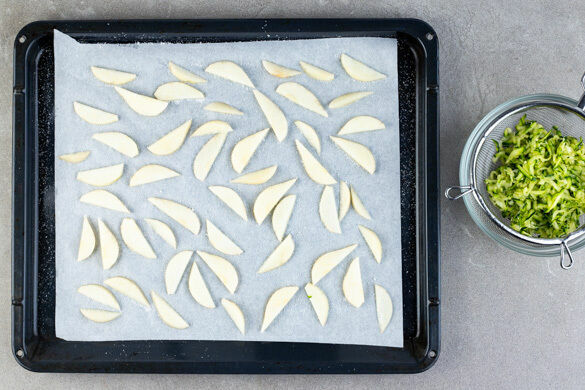 Den Backofen auf 220°C Umluft (240°C Ober-Unterhitze) vorheizen. Die Zucchini mit einer Küchenreibe raspeln und in einem Sieb möglichst viel Flüssigkeit ausdrücken. Die Birnen schälen, dann vierteln, entkernen und in dünne Scheiben schneiden. Auf einem mit Backpapier ausgelegten Backblech verteilen, mit etwas Zucker bestreuen und 8–10Min. im Ofen backen.