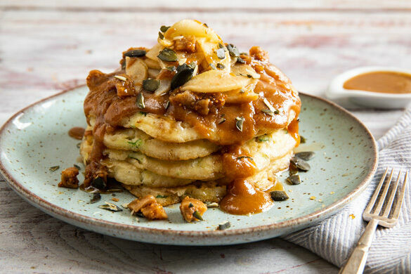 Die amerikanische Version des Pfannkuchens wird gerne im „stack“, also im Stapel, verzehrt beziehungsweise dargeboten. Und auch wir wollen heute keineswegs tiefstapeln, daher sagen wir hier mal ganz deutlich, dass die heutigen Pancakes sich nur mit zwei Worten passend beschreiben lassen: grandios und vegan. Lass Birne, Kürbiskerne, Erdnuss-Ahorn-Sauce und den fluffigen Teig für sich sprechen und überzeuge dich selbst!
