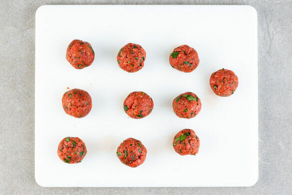 Ca. 1/4 der Kräuter samt Stängeln sehr fein, die übrigen Kräuter grob hacken. Das Hackfleisch mit der 1/2 des Tomatenmarks, den fein gehackten Kräutern und je 1 Prise Salz und Pfeffer gut verkneten. Mit feuchten Händen etwa walnussgroße Hackbällchen rollen, diese in eine Auflaufform geben und 12–15Min. im Ofen backen, bis die Hackbällchen durch sind.