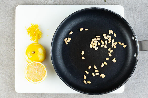 Die Pinienkerne in einer kleinen Pfanne ohne Zugabe von Fett bei mittlerer Hitze 1–2Min. goldbraun anrösten. Zum Abkühlen aus der Pfanne nehmen. Die Zitronenschale fein abreiben, dann die Zitrone halbieren.