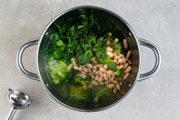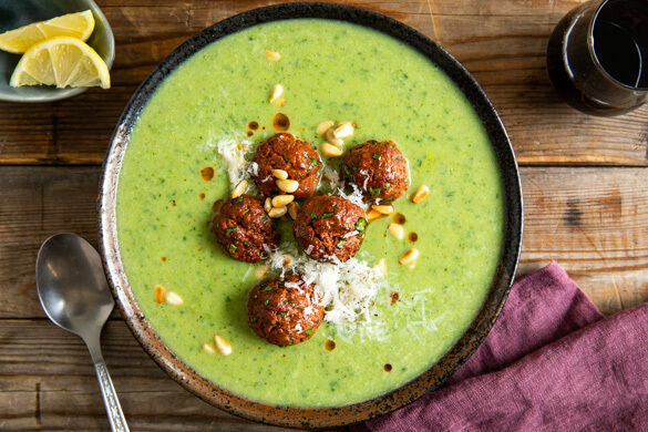Es gibt eindeutig zu wenig grüne Suppen auf dieser Welt. Diesen Missstand wollen wir teilweise beheben, und unser heutiger Kandidat scheint uns dafür bestens geeignet. Denn was könnte köstlicher grün sein als eine cremige Suppe mit weißen Bohnen, vollgepackt mit Brokkoli, Petersilie und Basilikum? Wohl nur wenig – vielleicht noch eine solche Suppe mit Hackbällchen, gerösteten Pinienkernen und Käse? Genau die haben wir. Ecco!