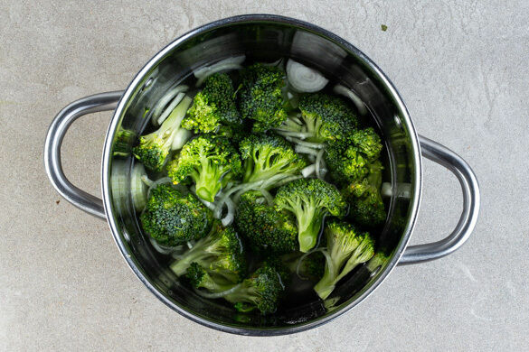 Den Brokkoli und die Zwiebeln in einem großen mit 1,5L Wasser bedecken und mit 2TL Salz würzen. Abgedeckt bei starker Hitze zum Kochen bringen und anschließend 8–10Min. bei mittlerer Hitze köcheln lassen.