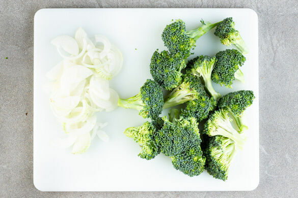Den Backofen auf 190°C Umluft (210°C Ober-/Unterhitze) vorheizen. Den Brokkoli in 2–3cm große Röschen schneiden. Die Zwiebeln schälen, halbieren und in dünne Streifen schneiden.