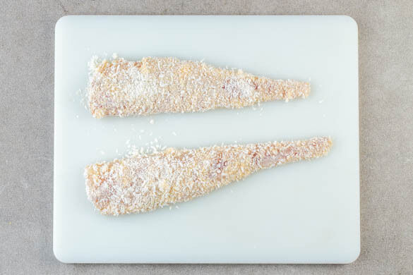 Den Backofen auf 220°C (200°C Umluft) vorheizen. Den Fisch trocken tupfen und evtl. vorhandene Gräten entfernen, dann mit 3EL Mehl bestäuben. 1 Ei auf einem tiefen Teller verquirlen. Die Kokosraspeln auf einen zweiten tiefen Teller geben. Den Fisch erst in dem Ei und dann in den Kokosraspeln wenden, bis er vollständig bedeckt ist.