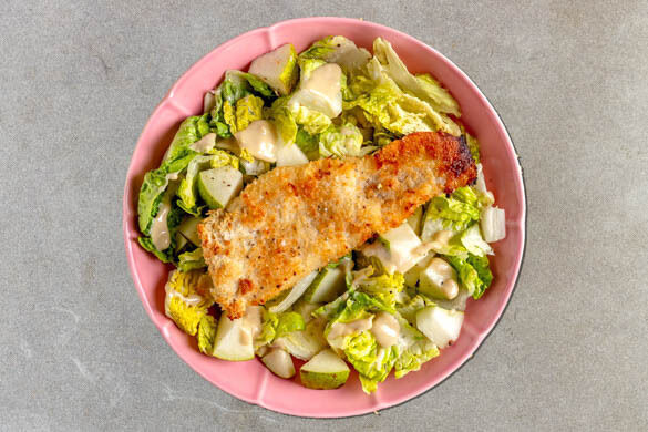Lust auf einen Hauch Exotik auf deinem Teller? Knusprig panierter Fisch schmeckt nicht nur mit Pommes gut, er passt auch ganz hervorragend auf einen Salat: Zartes Seehechtfilet in goldener Kokoskruste trifft heute auf fruchtig-frischen Birnensalat mit cremigem Tahinidressing. Dieses Gericht der Fusionsküche vereint knackige Leichtigkeit mit intensiven Aromen und wartet nun darauf, genüsslich verspeist zu werden. Guten Appetit!