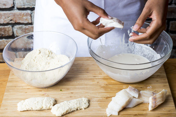 Das Panko-Paniermehl in eine Schüssel oder auf einen tiefen Teller geben. Die Fischstreifen erst in den Teig tauchen, dann im Paniermehl wenden und leicht andrücken, bis sie rundum gleichmäßig bedeckt sind.