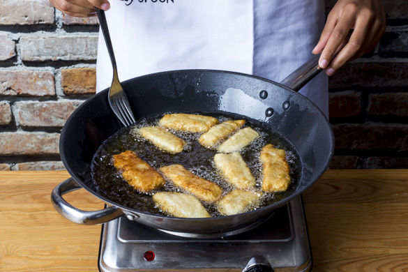 Die Fischstäbchen in einer mittelgroßen Pfanne mit 3EL Pflanzenöl bei starker Hitze vorsichtig auf jeder Seite in 2–3Min. goldbraun und knusprig braten. Die Fischstäbchen während des Bratens so wenig wie möglich bewegen und nach dem Braten auf etwas Küchenpapier abtropfen lassen.