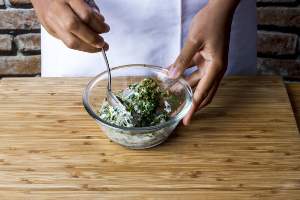 Inzwischen die Petersilienblätter von den Stängeln zupfen, ¾ der Blätter fein hacken. Die Kapern in einem Sieb abspülen und ebenfalls fein hacken. Die gehackte Petersilie und die Kapern mit der 2EL Mayonnaise verrühren. Den Dip mit Salz und Pfeffer abschmecken und bis zum Servieren kalt stellen.