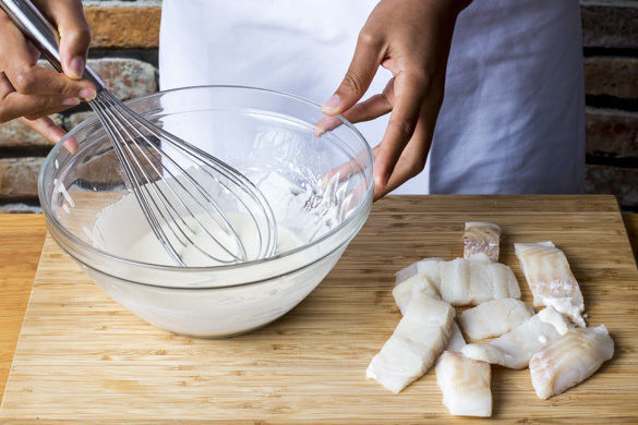 Aus 4EL Mehl, 1 Prise Salz und 70–80ml kaltem Wasser mit einem Schneebesen einen dickflüssigen, glatten Teig anrühren. Den Fisch kalt abspülen, trocken tupfen und in ca. 2cm breite, fingerlange Streifen schneiden. Vorsicht, der Fisch kann Gräten enthalten. Diese am besten jetzt mit einer Pinzette entfernen oder später beim Essen darauf achten.