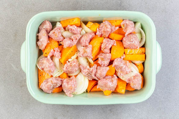 Die Pelle der Würste entfernen. Die Würste in mundgerechte Stücke schneiden und auf das Gemüse in der Auflaufform geben. Mit 2TL Olivenöl beträufeln und 20–25Min. im Ofen backen, bis die Würste gebräunt und die Süßkartoffeln gar sind.