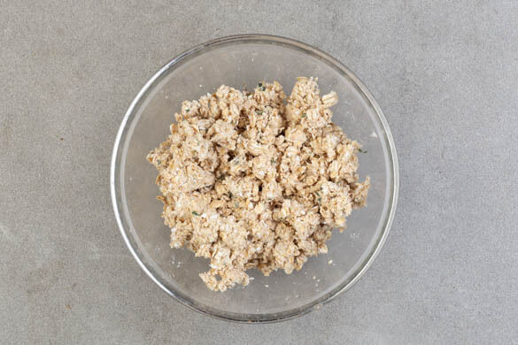 Die Thymianblättchen von den Stängeln streifen. Die Haferflocken und die Walnüsse in ein hohes Gefäß geben und mit einem Pürierstab in grobe Stücke mixen. In einer Schüssel die ½ des Thymians mit 1½TL Salz, 2TL Zucker, 5EL Wasser und 1EL Essig vermengen. 3EL kalte Butter hinzugeben und mit den Fingern in die Haferflockenmischung einarbeiten, bis sich Klumpen bilden.