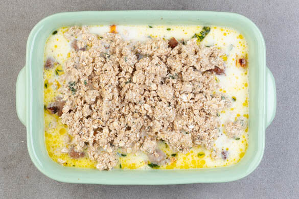 Die Sauce vom Herd nehmen, den Käse unterrühren und mit Salz und Pfeffer abschmecken. Dann gleichmäßig über die Würste und das Gemüse in der Auflaufform gießen und das Haferflocken-Topping über das Gratin streuen. Mit 1EL Olivenöl beträufeln und 15–20Min. im Ofen backen, bis das Gratin Blasen wirft und goldbraun ist. Ca. 5Min. ruhen lassen.