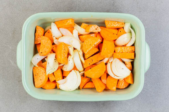 Den Backofen auf 200°C (180°C Umluft) vorheizen. Eine ca. 26x20cm große Auflaufform mit 1TL Olivenöl leicht einfetten. Die Süßkartoffeln schälen, halbieren und in ca. 1cm dicke Scheiben schneiden. Die Zwiebel schälen, halbieren und in ca. ½cm dünne Spalten schneiden. In der Auflaufform mit den Süßkartoffeln, 2TL Olivenöl sowie je 1 Prise Salz und Pfeffer vermengen.