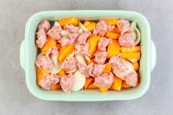 Die Pelle der Würste entfernen. Die Würste in mundgerechte Stücke schneiden und auf das Gemüse in der Auflaufform geben. Mit 1TL Olivenöl beträufeln und 20–25Min. im Ofen backen, bis die Würste gebräunt und die Süßkartoffeln gar sind.