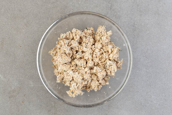Die Thymianblättchen von den Stängeln streifen. Die Haferflocken und die Walnüsse in ein hohes Gefäß geben und mit einem Pürierstab in grobe Stücke mixen. In einer Schüssel die ½ des Thymians mit ¾TL Salz, 1TL Zucker, 2½EL Wasser und ½EL Essig vermengen. 1½EL kalte Butter hinzugeben und mit den Fingern in die Haferflockenmischung einarbeiten, bis sich Klumpen bilden.
