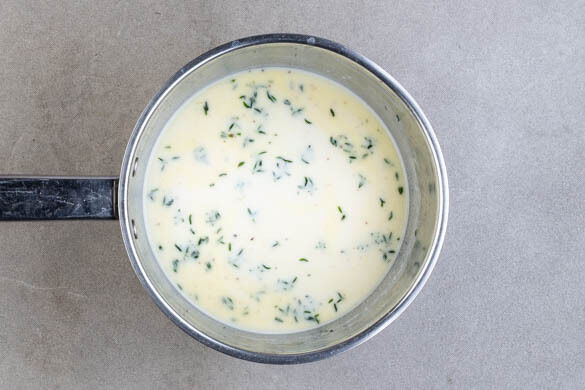 Den Knoblauch schälen und durch eine Knoblauchpresse drücken oder sehr fein würfeln. 1EL Butter in einem kleinen Topf bei mittlerer Hitze schmelzen. 1EL Mehl, den Knoblauch und die ½ des restlichen Thymians unterrühren und 1–2Min. anschwitzen. Nach und nach 200ml Milch und 100ml Wasser einrühren und 1–2Min. köcheln, bis die Sauce leicht eindickt.