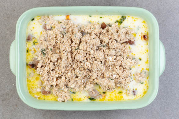 Die Sauce vom Herd nehmen, den Käse unterrühren und mit Salz und Pfeffer abschmecken. Dann gleichmäßig über die Würste und das Gemüse in der Auflaufform gießen und das Haferflocken-Topping über das Gratin streuen. Mit ½EL Olivenöl beträufeln und 15–20Min. im Ofen backen, bis das Gratin Blasen wirft und goldbraun ist. Ca. 5Min. ruhen lassen.