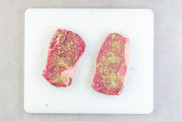 Die veganen Steaks trocken tupfen und rundum mit der Gewürzmischung einreiben.