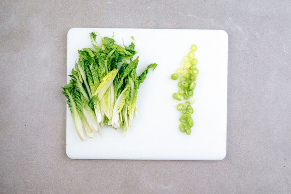 Inzwischen den Salat der Länge nach in grobe Streifen schneiden. Die Lauchzwiebeln in sehr feine Ringe schneiden.