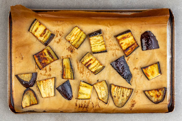 Die Auberginen auf einem mit Backpapier ausgelegten Backblech verteilen und im oberen Drittel des Ofens von jeder Seite 7–10Min. grillen bzw. backen, bis sich deutliche Röstspuren abzeichnen. Die ½ der Currypaste (oder weniger, wenn es nicht scharf sein soll) mit 2EL Pflanzenöl in der Pfanne bei mittlerer bis niedriger Hitze ca. 1Min. duftend anbraten.