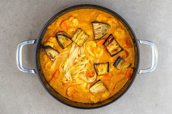 Die Limette in 4 Spalten schneiden. Die Garnelen in einem Sieb kalt abspülen und anschließend trocken tupfen. Die Garnelen mit den Auberginen in das Curry rühren und in 3–5Min. gar köcheln. Mit Salz und Pfeffer abschmecken und die Pasta untermengen. Die Curry-Pasta mit den Kokosraspel und den Limettenspalten garniert servieren.